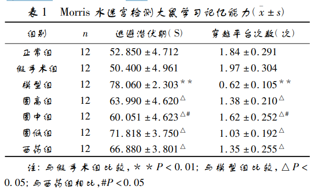 與正常組比較,假手術組逃避潛伏期無明顯變化( P > 0. 05) 。與假手術組比較,模型組逃避潛伏期顯著延長、穿 越平臺次數減少,學習記憶能力下降,差異有顯著性( P < 0. 01) ; 經藥物干預后,大鼠學習記憶能力有所提升,與模型 組比較,各治療組逃避潛伏期均明顯縮短,穿越平臺次數增 加,差異有顯著性( P < 0. 05) ; 與西藥組比較,固中組逃避 潛伏期縮短,穿越平臺次數增加,療效較西藥組佳,差異具 有顯著性( P < 0. 05) 。見表 1。