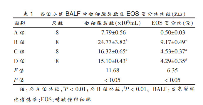 A 組小鼠氣道黏膜無(wú)增厚,氣道周圍無(wú)炎癥細(xì)胞 浸潤(rùn),肺泡壁結(jié)構(gòu)完整;B 組小鼠氣道黏膜充血水腫, 氣道周圍較多炎癥細(xì)胞浸潤(rùn),肺泡結(jié)構(gòu)被破壞;C 組 小鼠氣道周圍少量炎癥細(xì)胞浸潤(rùn),管壁無(wú)明顯增厚; D 組小鼠程度與 C 組小鼠相似。 見圖 1(封四)。2.3 各組小鼠 BALF 中白細(xì)胞總數(shù)和 EOS 百分比的 比較 與 A 組比 較,B 組小 鼠 BALF 中白 細(xì) 胞 總 數(shù) 和 EOS 百分比均顯著升高,差異有高度統(tǒng)計(jì)學(xué)意義(P < 0.01)。 與 B 組比較,C 組和 D 組小鼠 BALF 中白細(xì)胞 總數(shù)及 EOS 百分比明顯降低,差異有高度統(tǒng)計(jì)學(xué)意 義(P < 0.01)。C、D 兩組白細(xì)胞總數(shù)和 EOS 百分比比較, 差異無(wú)統(tǒng)計(jì)學(xué)意義(P > 0.05)。 見表 1。