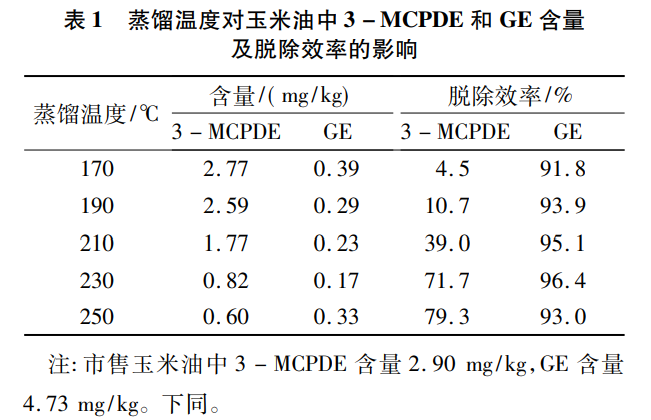 取進油速度 160 mL /h、刮膜速率 240 r/min,在 蒸餾溫度分別為 170、190、210、230、250 ℃ 的條件下 對玉米油進行分子蒸餾處理,玉米油中 3 - MCPDE 和 GE 的含量變化如表 1 所示。