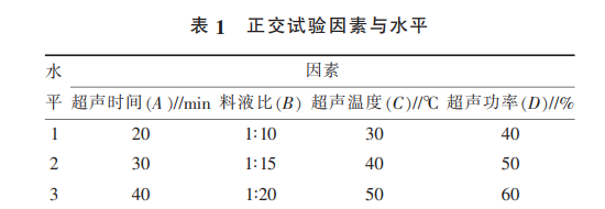 將樺褐孔菌粉末過(guò)篩, 準(zhǔn)確稱(chēng)取 5 g 粉末溶于 30%的乙醇溶液中,分別改變提取條件為提取溫度、 提取時(shí)間、料液比以及超聲功率,用 80%的乙醇溶 液沉淀多糖后,4 000 r / min 離心 7 min 后取上清液, 減壓濃縮至浸膏后水浴至干,得粗制多糖,通過(guò)標(biāo)準(zhǔn) 曲線的方法測(cè)定含量。