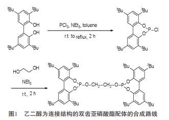 以乙二醇為連接結(jié)構(gòu)的雙齒亞磷酸酯配體的合 成路線如圖1所示。