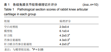 實驗選用新西蘭白兔50只,分為 5組,實驗過程無脫失,全部進入結(jié)果分析。空白對照組膝關(guān)節(jié)軟骨無明顯 磨損, 周圍滑膜無明顯增生及炎性改變。模型組液組膝關(guān) 節(jié)磨損較為嚴(yán)重,軟骨破壞達到3級,但并未暴露軟骨下骨, 周圍滑膜增生及炎性改變較為明顯。針刀組、丹參注射液 組、針刀聯(lián)合丹參注射液組膝關(guān)節(jié)輕度磨損,1級到2級, 周圍滑膜增生及炎性改變不明顯,兩組在大體觀下無法辨 別磨損嚴(yán)重程度的差異??瞻讓φ战M 軟骨表明光滑、軟骨細胞梭形排列,形態(tài)、數(shù)目、結(jié)構(gòu)基 本正常,無血管翳生成;模型組表層軟骨細胞明顯減少, 細胞排列紊亂;針刀組軟骨表層較為光滑、軟骨細胞數(shù)目 結(jié)構(gòu)基本正常;丹參注射液組軟骨表層光滑、軟骨細胞排 列輕度紊亂,局部缺損;針刀聯(lián)合丹參注射液組軟骨表層 較為光滑,軟骨細胞數(shù)量結(jié)構(gòu)基本正常。見圖1。病理切片 評分,丹參注射液組評分略高于針刀組和針刀聯(lián)合丹參注 射液組,但此3組之間差異無顯著性意義。見表1。