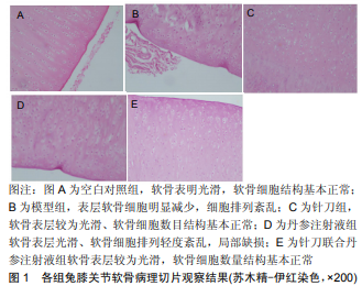 干預(yù)結(jié)束后,麻醉下耳緣靜脈空氣栓塞處死動物。切開關(guān)節(jié)囊,暴露脛骨、股骨軟 骨面,大體觀察兔膝關(guān)節(jié)軟骨面情況。