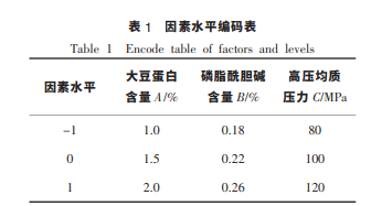 乳化制備工藝響應面優(yōu)化 以大豆蛋白-磷脂酰 膽堿納米乳液的平均粒徑、PDI 及乳化產率為考 察指標,通過單因素試驗考察大豆蛋白含量、磷脂 酰膽堿含量、 高壓均質壓力及均質次數對 3 個指 標的影響規(guī)律。 進一步利用 Design-Expert 軟件對 試驗進行響應面分析設計優(yōu)化試驗結果, 選取大 豆蛋白含量 A(%)、磷脂酰膽堿含量 B(%)、高壓 均質壓力 C(MPa)及均質次數 D(次)4 個因素為 自變量, 以粒徑 R1 (nm)、PDI R2 及乳化產率 R3 (%)為響應值,設置三因素三水平進行試驗,如表 1 所示。