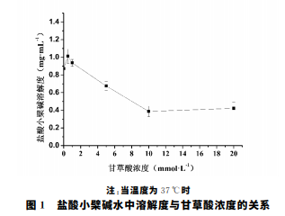 如圖1所示,選用不同濃度甘草酸后,隨著濃度的增加, 鹽酸小檗堿溶解度隨之下降。當甘草酸濃度為10mmol·L-1 時,此時鹽酸小檗堿的溶解度最低,與純水中的溶解度相比, 溶解度下降了2.3倍。繼續加大甘草酸的濃度后,鹽酸小檗 堿的溶解度變化不明顯。