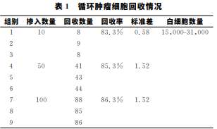 NCI-H1975 細胞培養(yǎng)至融合度約為80%后用胰酶進行消化,加 入 CelltrackerCMFDA 染色工作液,于細胞正常生 長條件下孵 育30 min。換用新鮮培養(yǎng)基繼續(xù)培養(yǎng) 30min,將細胞 用 PBS漂洗 后,在熒光顯微鏡下使 用單細胞挑取系統(tǒng)挑取準確數(shù)量的細胞,按 照 5CTC/3 ml、25CTC/3 ml、50CTC/3 ml摻 入 全 血 中,每組設(shè)3個組內(nèi)平行。 分別按照CTC定量檢測試劑盒及ClearCell○R FX1 循環(huán)腫瘤細胞活性分離系統(tǒng)說明書進行 CTC分離操 作,得到的細胞懸液置于96孔板中,在熒光顯微鏡下 進行觀察計數(shù)。按以下公式進行回收率計算:CTC回 收率=觀測CTC數(shù)量/摻入CTC總數(shù)×100%。
