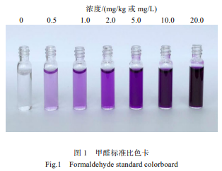 將甲醛標準溶液配制成 0、0.5、1、2、5、10、20 mg/L 濃度的甲醛標準系列工作液, 同樣品按照 AHMT 比色卡法 測定, 得到濃度系列為 0、5、10、20、50、100、200(mg/kg或 mg/L)甲醛標準比色卡, 見圖 1