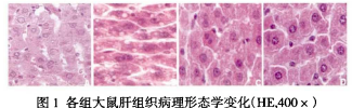 取血后 , 即 刻取出 肝臟 , 取 部分肝組織用 1 0 %甲 醛 固定 , 常規石蠟包埋 切片 , HE 染色 , 光學顯微鏡下觀察 。