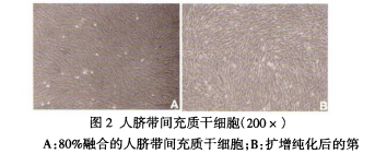經醫院 醫學倫理委員會 批準。 經過產婦知 情同 意后 , 采集正常 足 月 剖宮產 健康胎兒臍帶組織 , 置人 Ha nk ’ s 液 , 4 尤保存 。 在 超凈 臺 內 取 出 胳帶 , 用 PB S 沖洗血液 , 用 手術 刀剔 除胳 帶 內血管 , 將臍帶剪成 1  ̄ 2 _3 組織塊 , 放 人培養瓶 , 加人 I I 型 膠原酶消 化 , 過濾 、 收集 細胞 , 接種在 6 孔板內 , 置于 C 02 培養箱 內 培 養。 96 h 后半量更 換培養液 , 以 后 隔 半天半量換 液 , 顯微鏡 下 觀察 , 大約 1 0 d 后 , 細 胞融合達到 8 0 %時 , 進行 傳 代培 養。